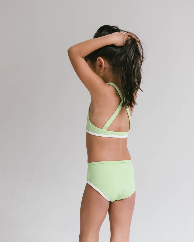Top nadador com costas cruzadas em elástisco e viés contrastante, calcinha básica de cava baixa e viés contrastante.