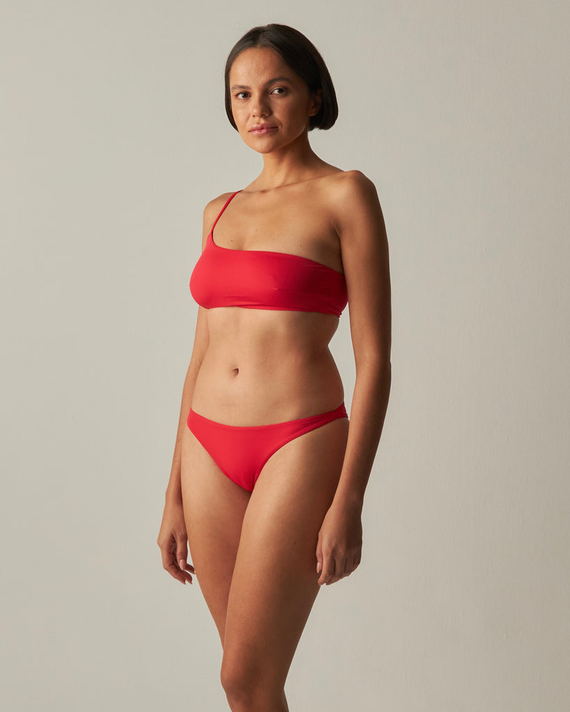 Top de ombro único com pences horizontais e alça fina.